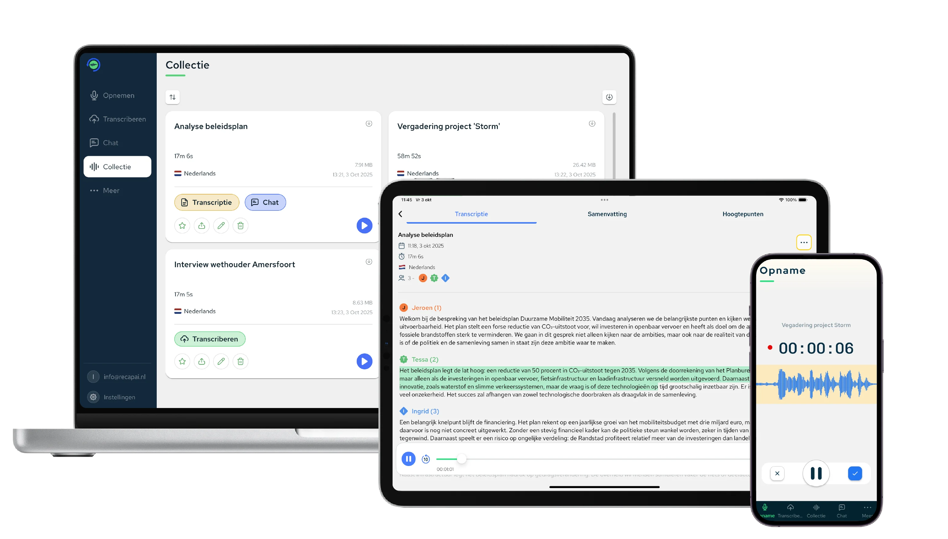 RecapAI is speciaal ontwikkeld voor de Nederlandstalige professional. Met één druk op de knop worden al je gesprekken automatisch uitgeschreven, samengevat en voorzien van duidelijke actiepunten. Meteen klaar om te delen.